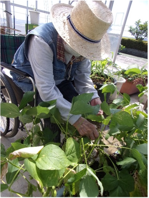 リハビリスタッフと入所者と協働で収穫です。