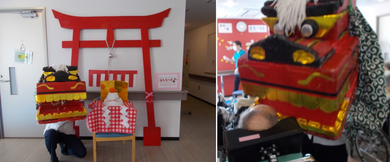 まずは介護医療院でのお餅つきからご紹介します。獅子舞や鳥居なども準備し、非日常的な雰囲気の中で始まりました。