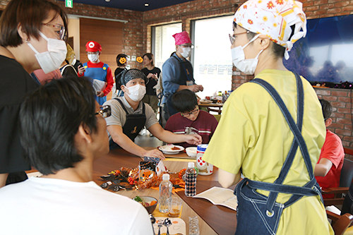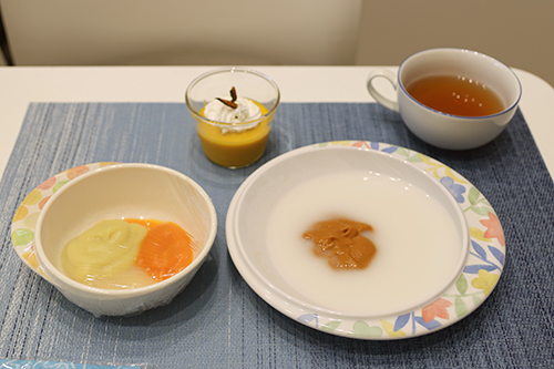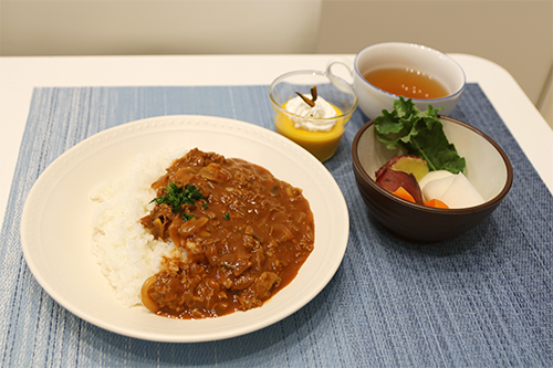今回のメニューは、トマト風味のハヤシライス・季節の蒸し野菜サラダ・ほっくりかぼちゃムース・アップルシナモンミルクティーです。今回も事前に伺ったご希望の食形態に合わせて提供するため、茹で方や切り方など管理栄養士がしっかりと監修しながら準備しました。