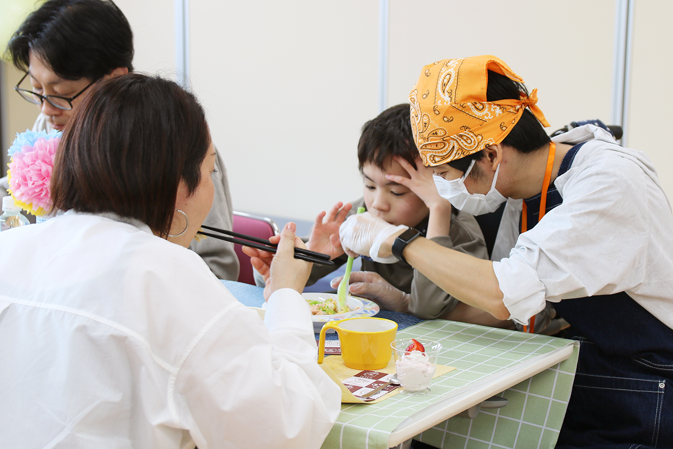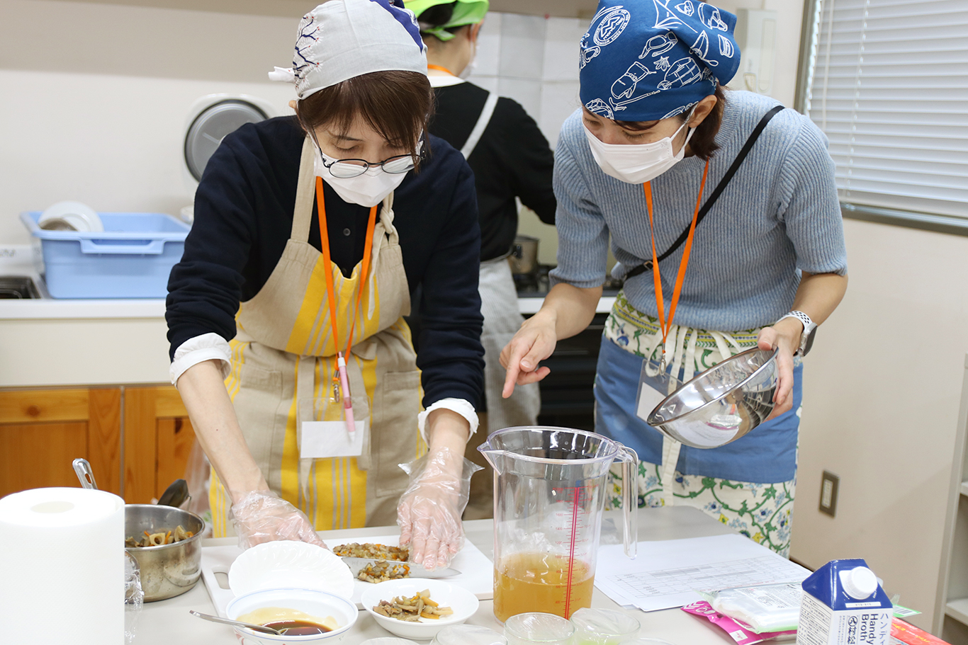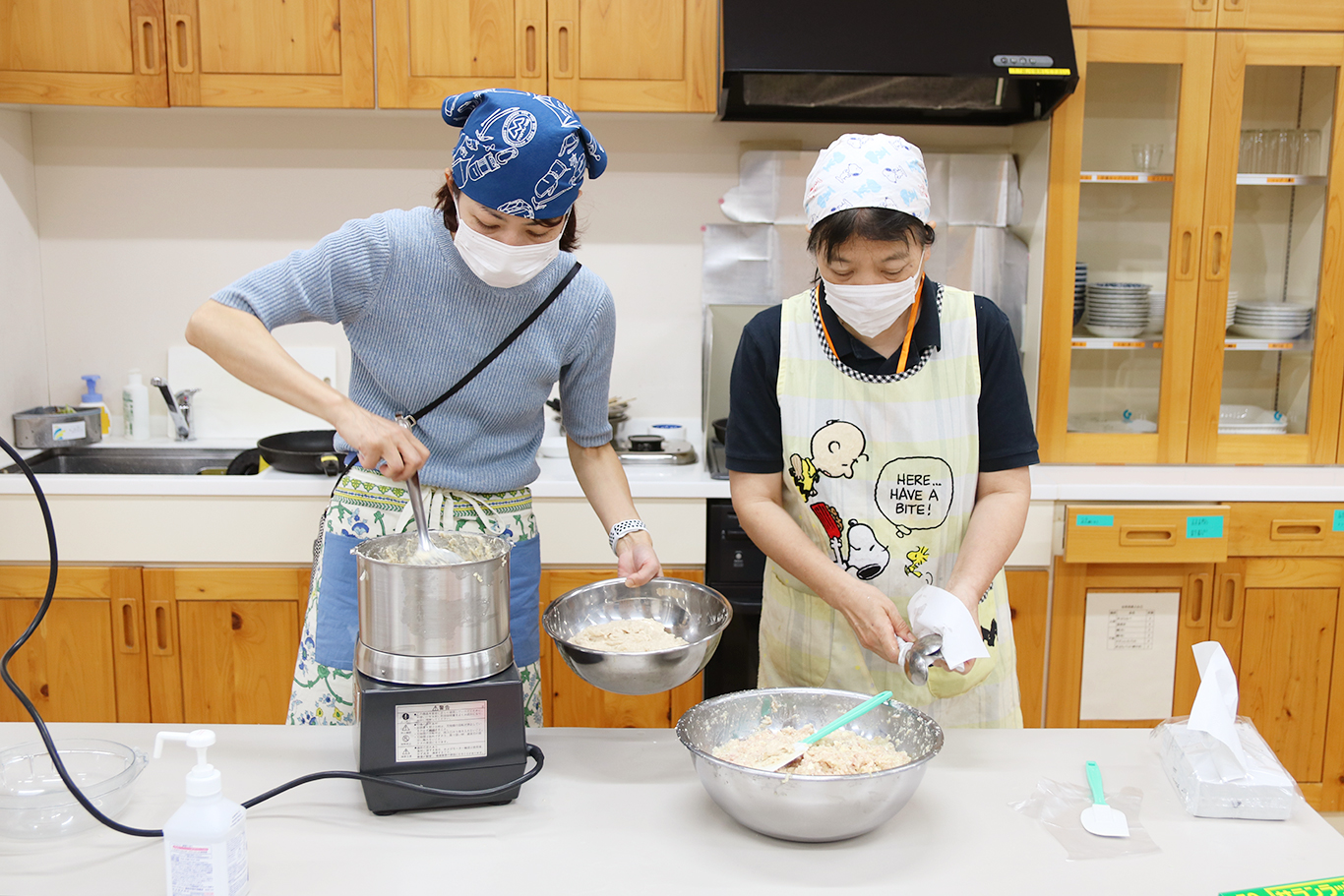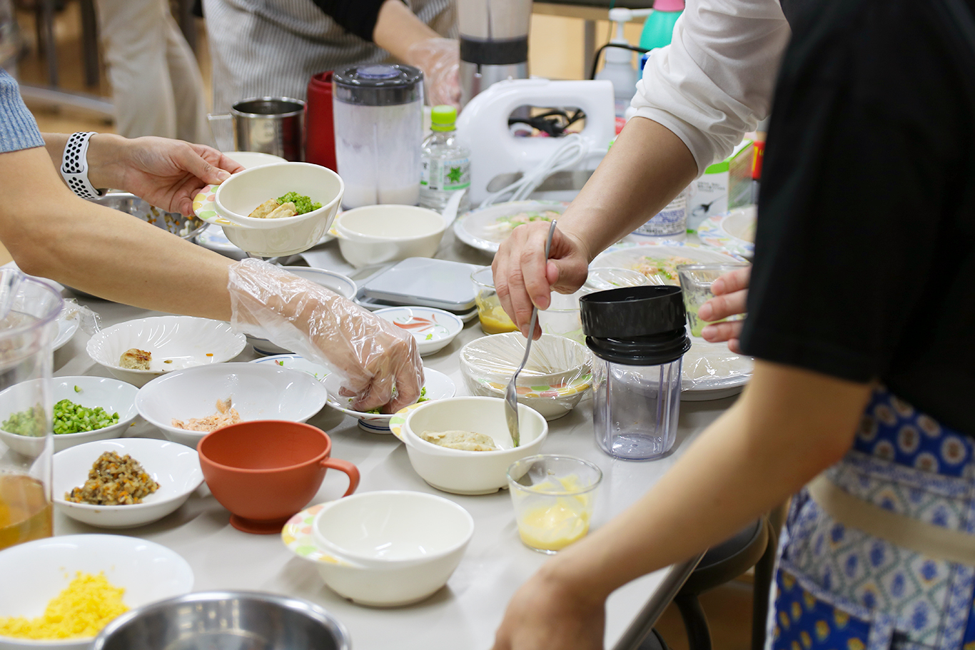 参加者に合わせて、常食・刻み食・ペースト食の3種類の食形態で提供するため、会場づくりがひと段落した言語聴覚士(ST)たちも調理場に合流し、額を寄せあい、とろみの具合や食感のチェックを熱心に行なっていました。