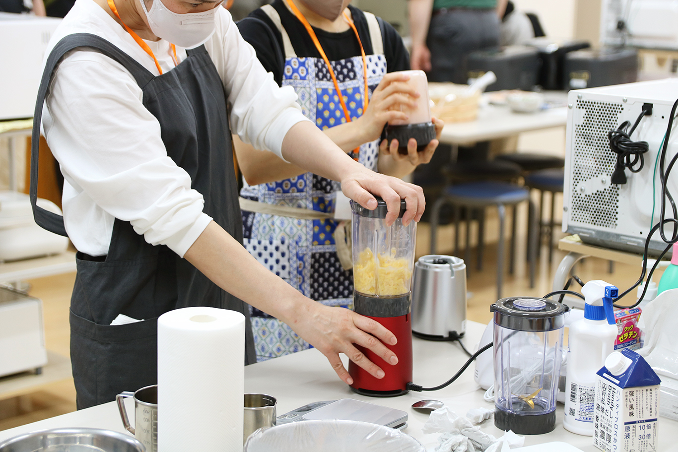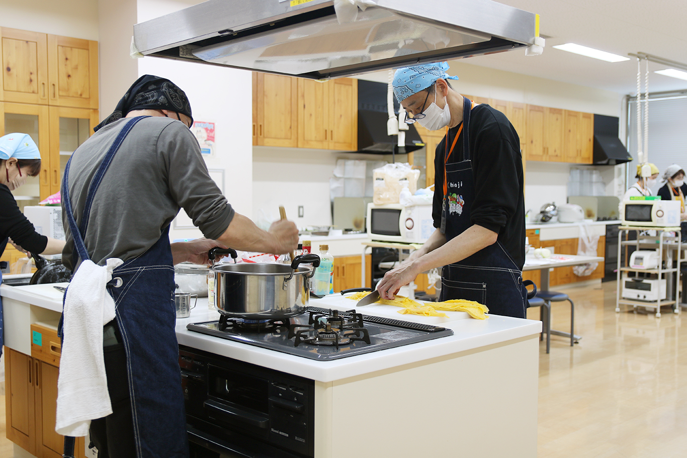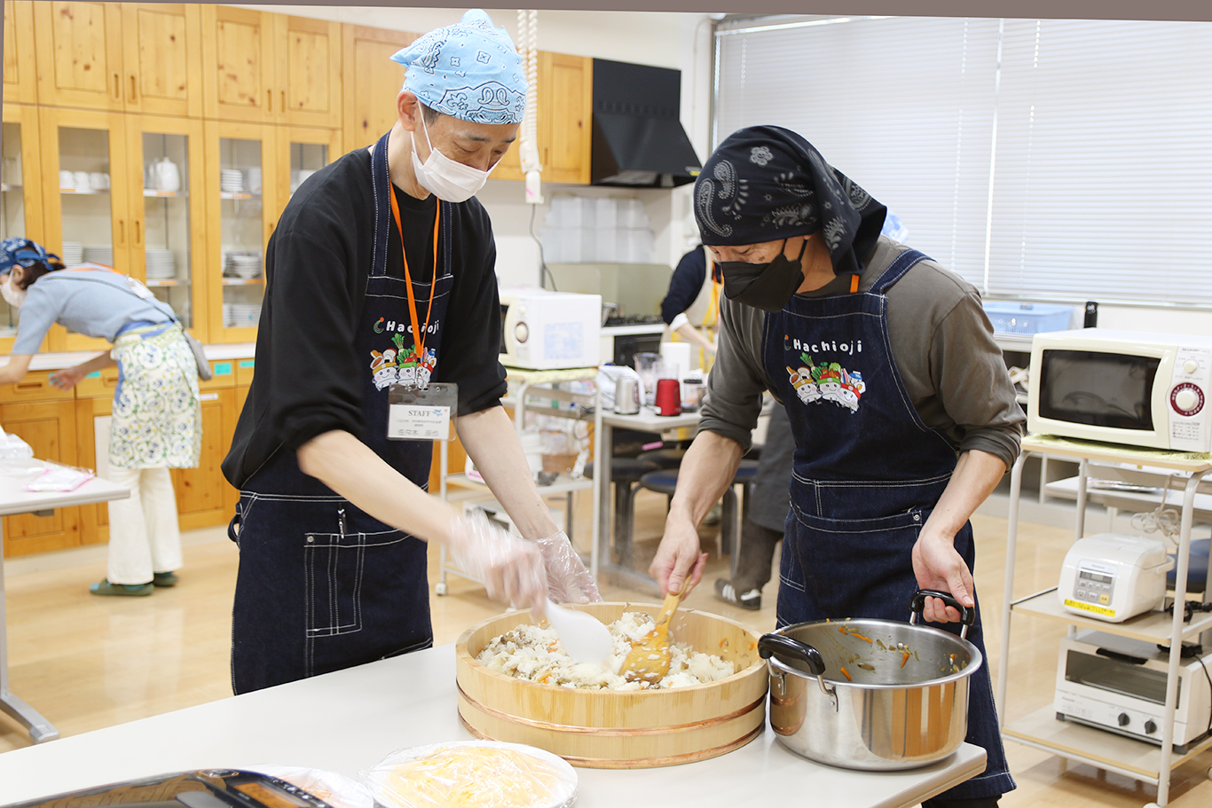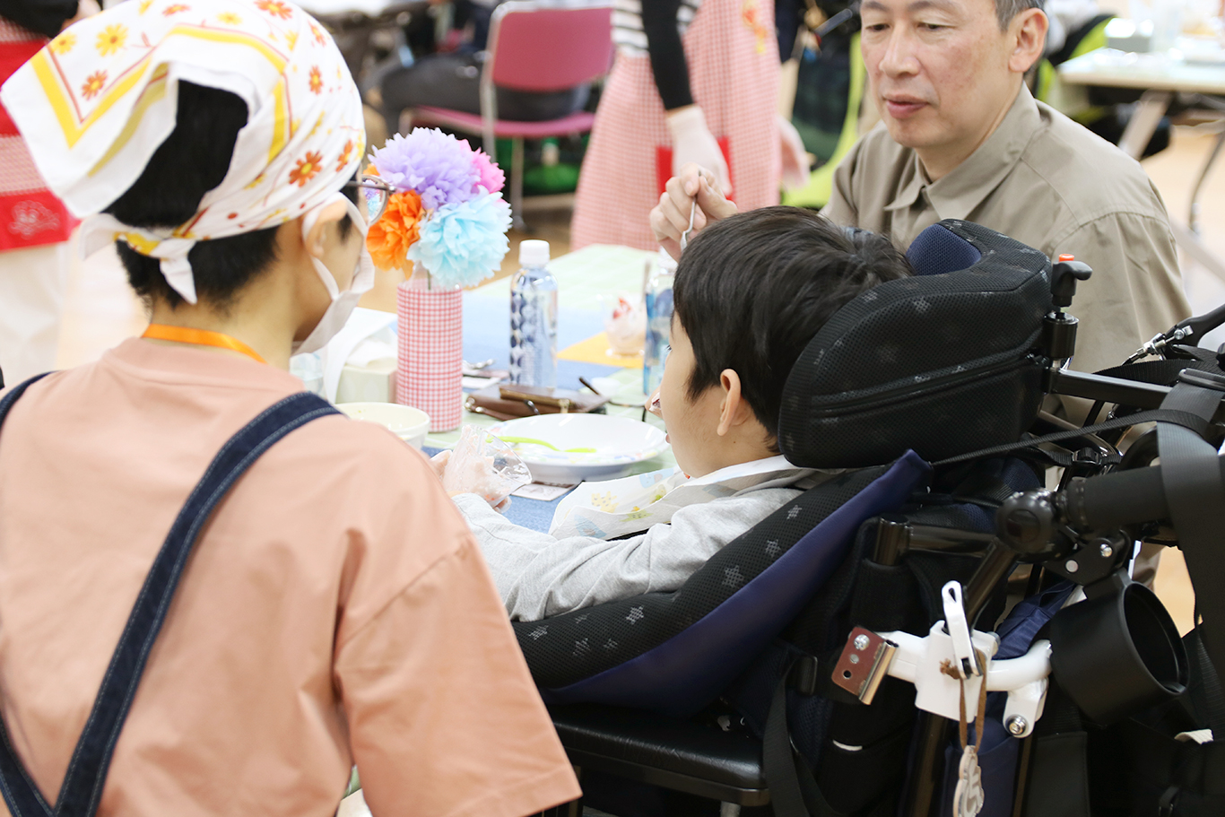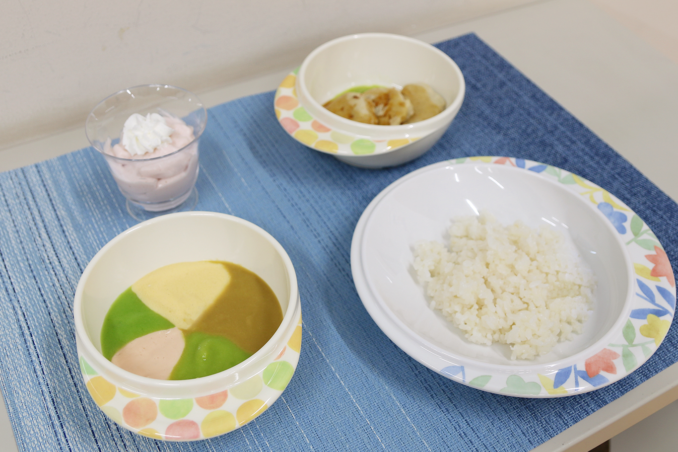 参加者に合わせて、常食・刻み食・ペースト食の3種類の食形態で提供するため、会場づくりがひと段落した言語聴覚士(ST)たちも調理場に合流し、額を寄せあい、とろみの具合や食感のチェックを熱心に行なっていました。