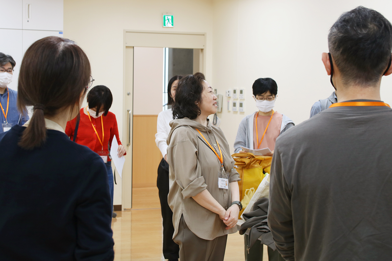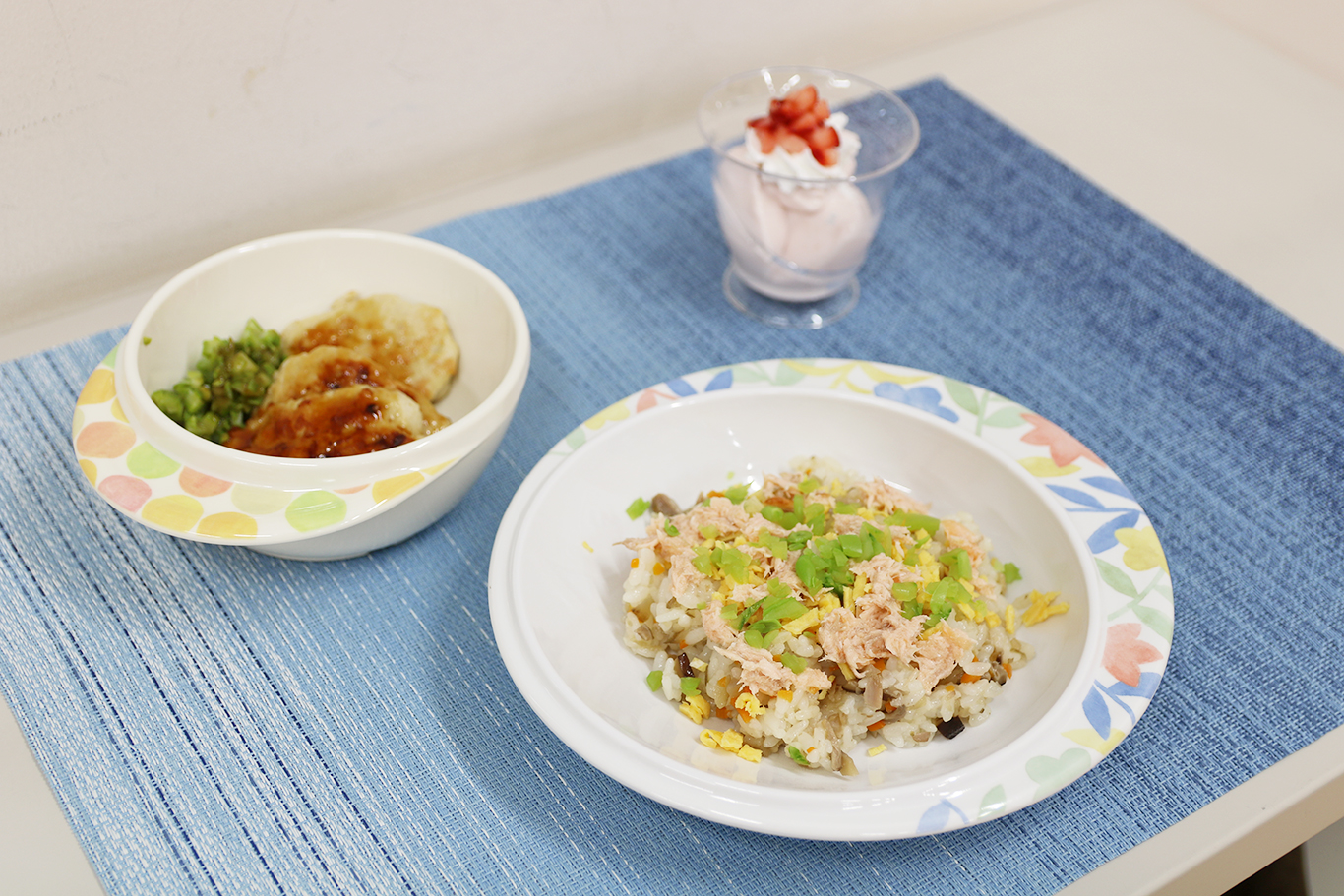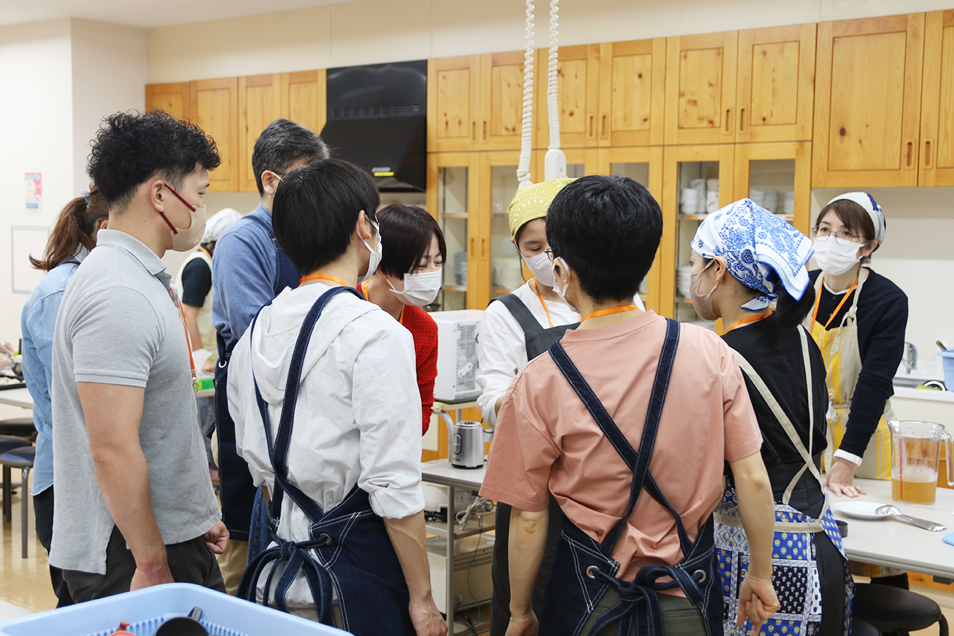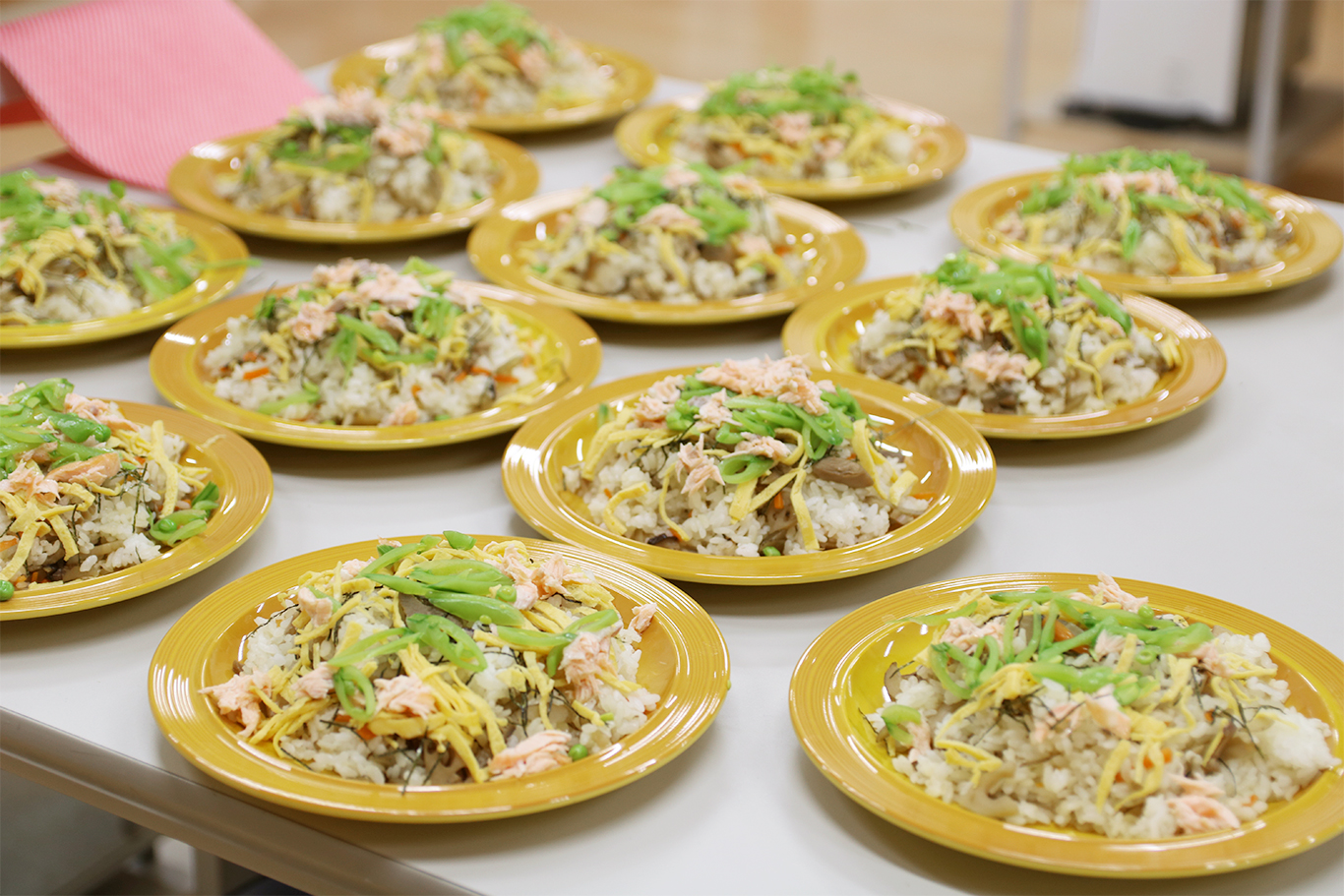 参加者に合わせて、常食・刻み食・ペースト食の3種類の食形態で提供するため、会場づくりがひと段落した言語聴覚士(ST)たちも調理場に合流し、額を寄せあい、とろみの具合や食感のチェックを熱心に行なっていました。