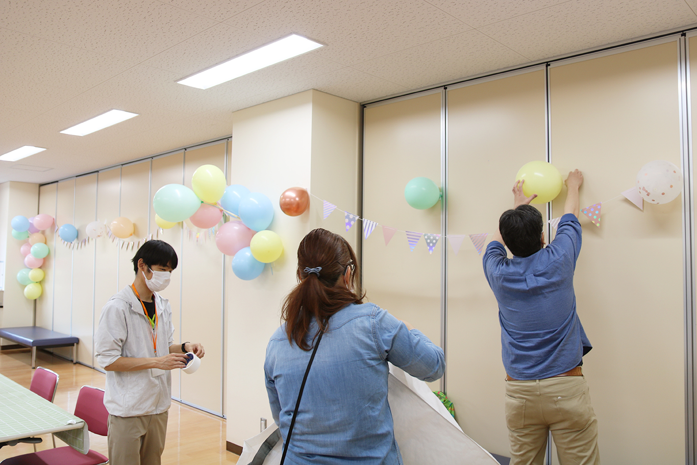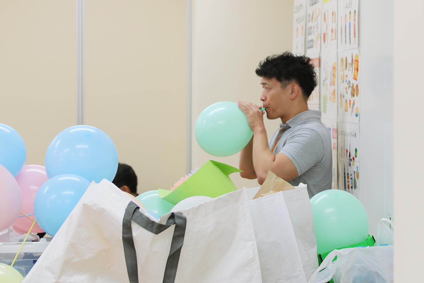 会場では、春らしい飾り付けのために風船をせっせと膨らませる姿が。