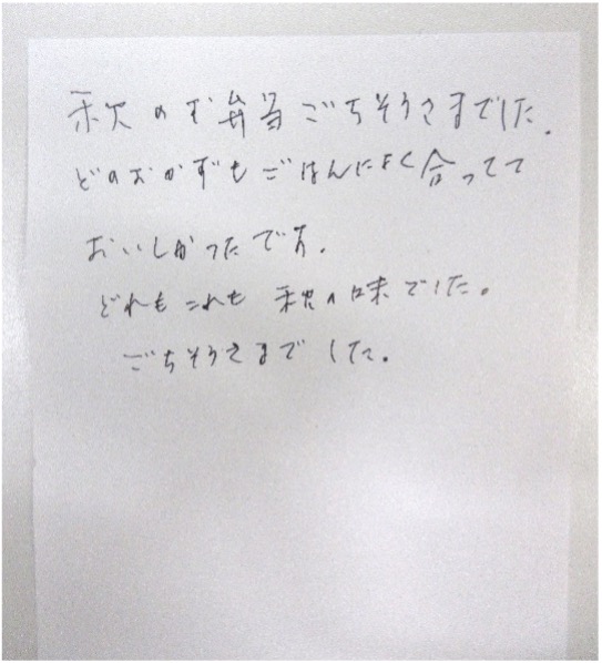 患者様からは「すっごく美味しい!!入院中にこんなの食べられるとは思わなかった。嬉しくて涙が出ちゃった。」、「弁当っていうのがまた良いね!」とのお言葉やお手紙もいただきました。