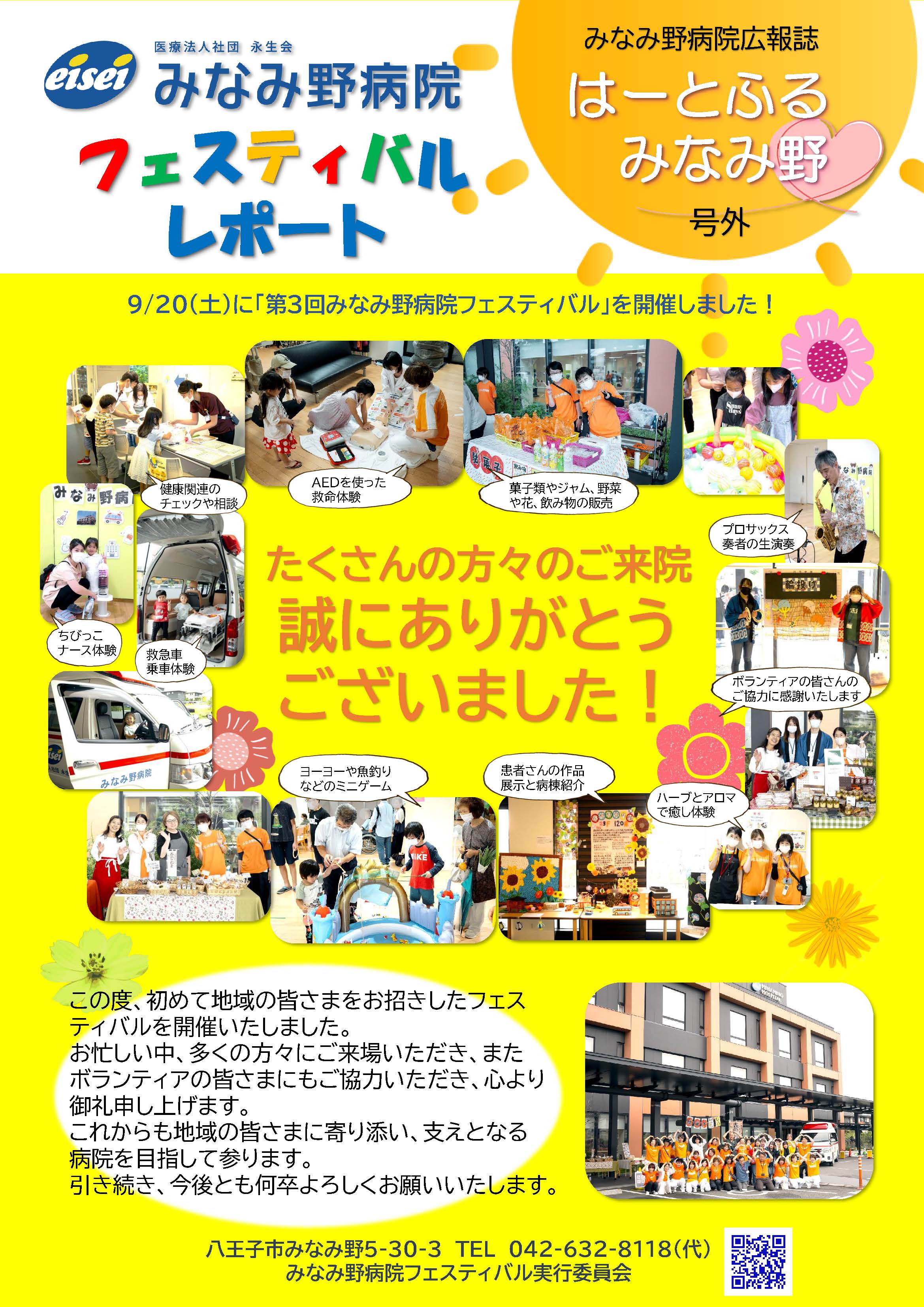 みなみ野病院フェスティバルご来場の御礼 令和7年9月20日(土)に、地域の皆さまをお招きしたフェスティバルを開催いたしました。 お忙しい中、多くの方々にご来場いただき、またボランティアの皆さまにもご協力いただき、心より御礼申し上げます。 これからも地域の皆さまに寄り添い、支えとなる病院を目指して参ります。 引き続き、今後とも何卒よろしくお願いいたします。