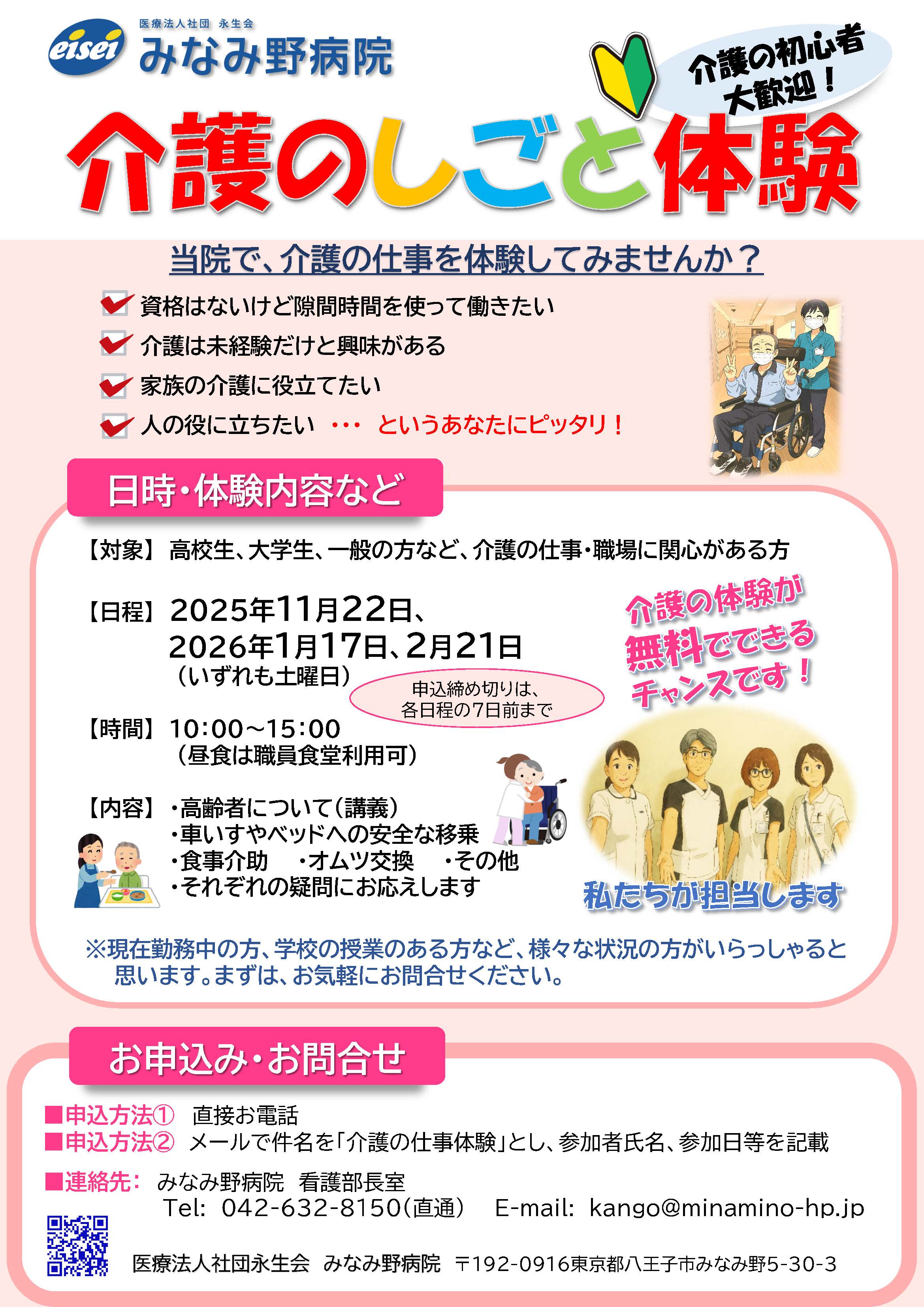 ・連絡先:Tel: 042-632-8150(直通)E-mail: kango@minamino-hp.jp